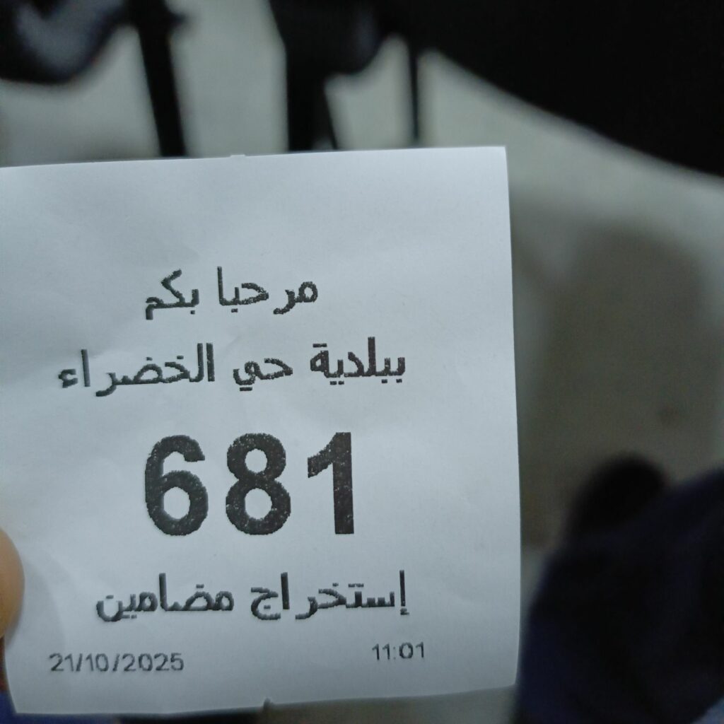 فقط جلست وسط الناس أنتظر ثم خرجت، قبل أن أخرج أعطيت الرقم لموظف يقوم بأقتطاعه للمراجعين، يمكن إستخراج المضمون عن بعد لكن التطبيقة ليست سلسة في الإستعمال…