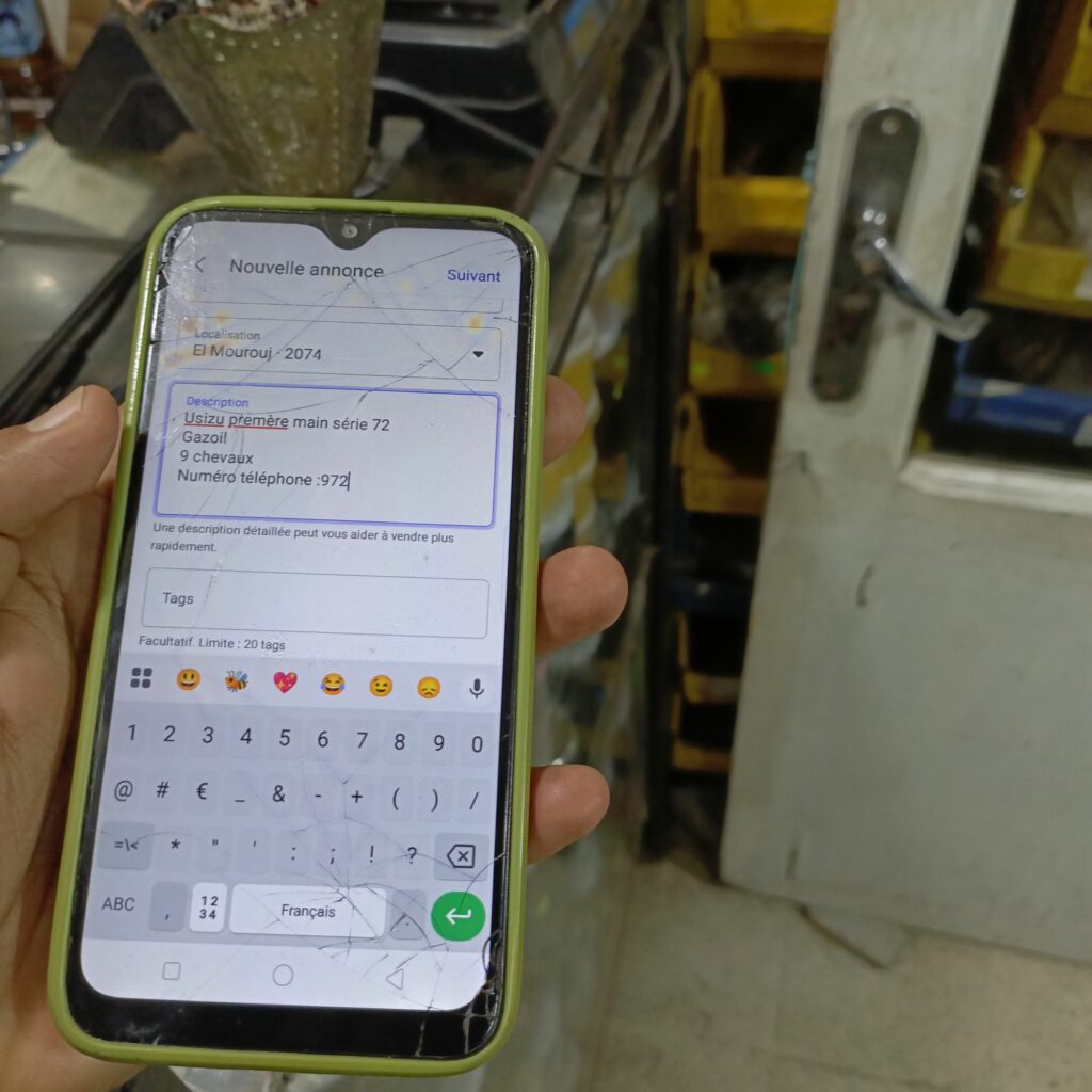 بعته برنامج للمبيعات موجه للأميين ونصف الجهلة، البرنامج من إنتاج شركتنا وسعره ممتاز كذلك بسيط جدا وموجه فعلا للأميين فيمكنه أن يعرف ما يبيع بالصور أو يمرر قارئ الكود كي أر على المنتج فيضيفه للمجموع ، كما يمكنه إستعمال التطبيق، البرنامج بالتعاون مع جامعة ماليزية وجامعة من تونس فيه عدد من المتداخلين ، طلب مني أن أبيع له شاحنته الي يستعملها لنقل الصناديق سعرها 18500 دينار يعني 6 آلاف دولار فقمت بتعليمه كيف يضع إعلانا يومها كنت في سوق السيارات…