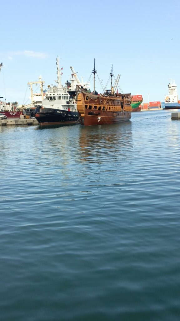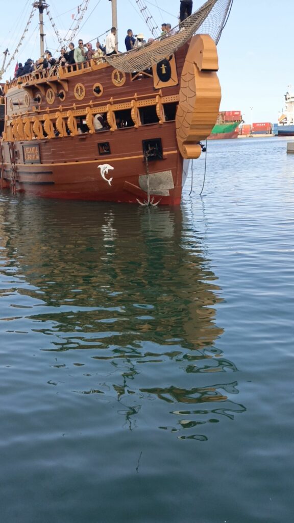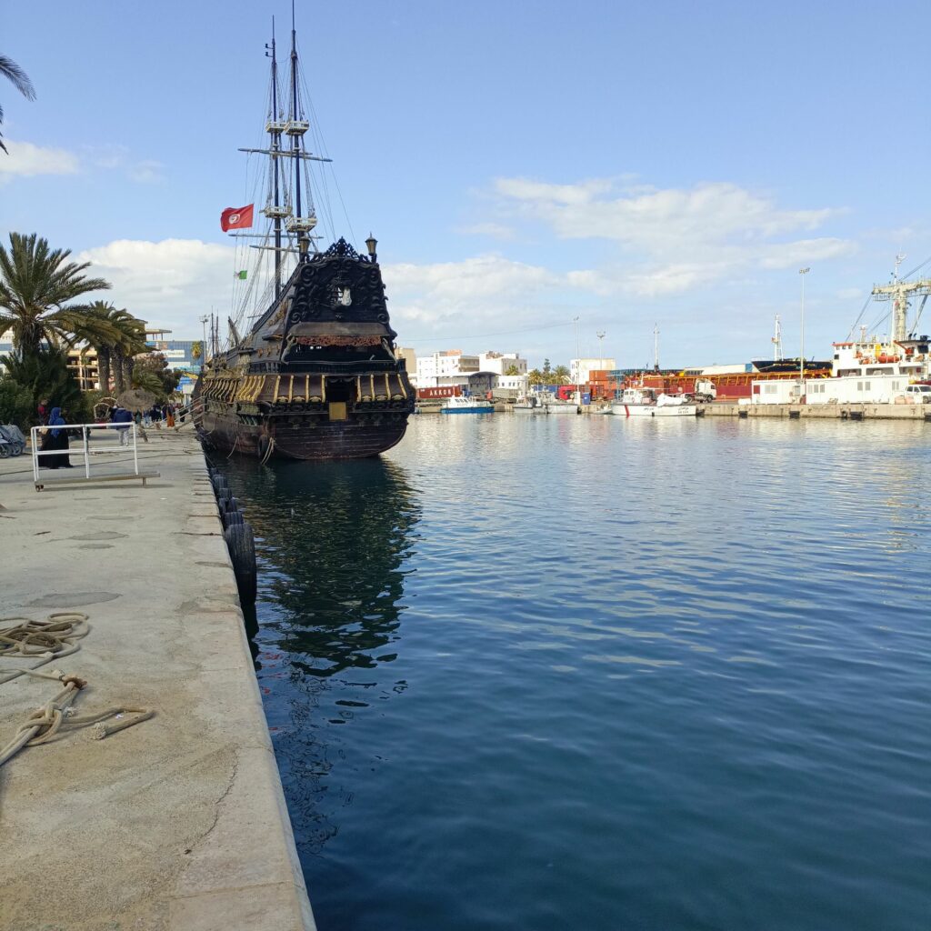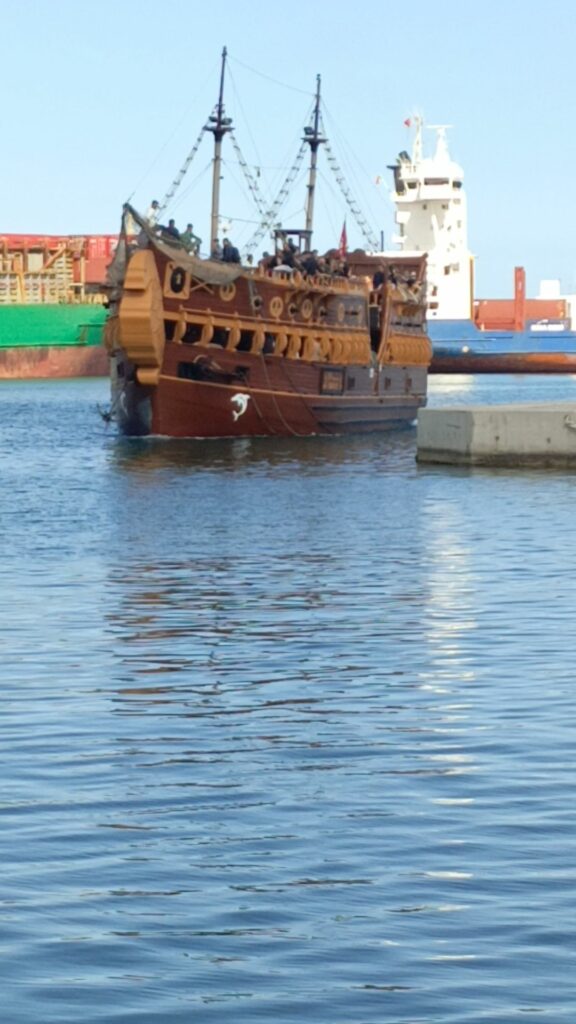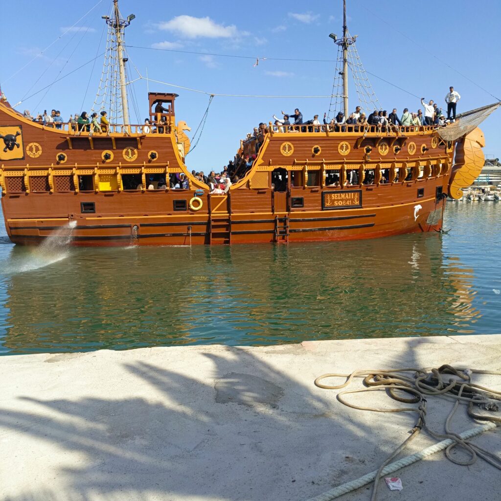 هناك سفن تقدم جولات في البحر ، تشبه سفن القراصنة … سعر الرحلة 25 دينارا وتدوم ساعتين ونصف تقريبا 8 دولارات… جائت مجموعة من الحافلات التي تقل سياحا جزائريين ، إحدى السفن كانت تدخل المرفأ وتشغل أغنية راي…